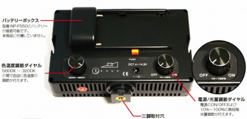 本体の2つのダイヤルでデイライト(5600K)~タングステン(3200K)の間で無段階の色温度調節や、全体の光量調節(10%~100%)が可能。