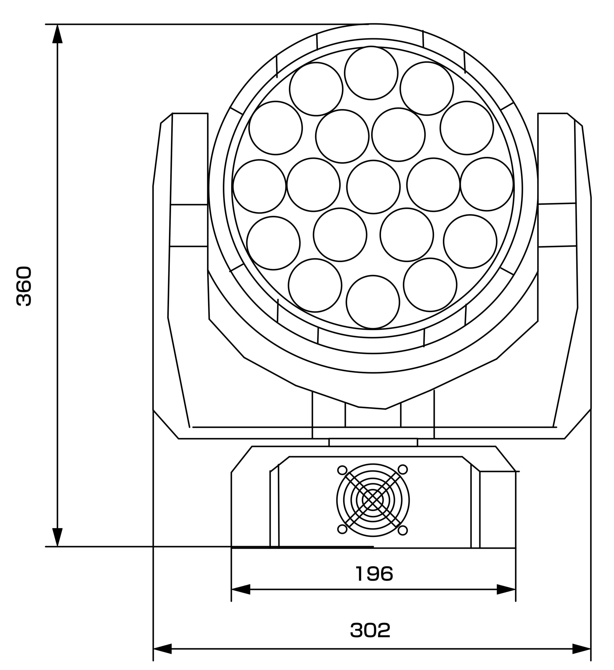■10w Quad LED RGBW×19個■DMXchモード:14/25ch■ズーム:11〜58°■パン:540°■チルト:232°■フリッカーフリー■ライフタイム:50000h■DMXコネクター:XLR5Pin付属品:5Pin-3Pin変換ケーブル■サイズ:W302mm×D302mm×H360mm■重量:5.6kg■電源:110-240V AC 50/60Hz■受電コネクター:平行プラグ付属品:C型20Aプラグー平行メス変換ケーブル■消費電力:260W(最大)