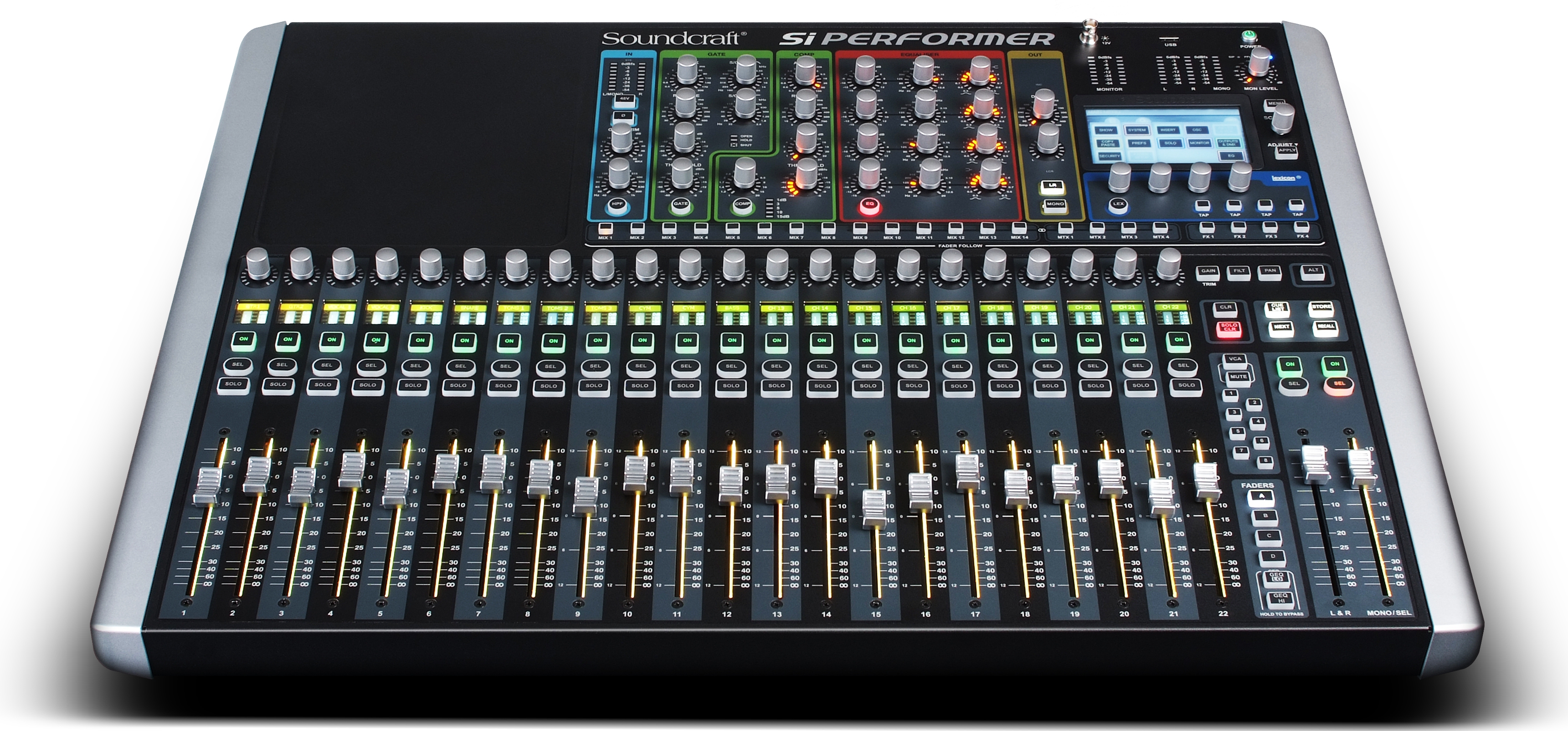 “Si Performer”は、1台で自在な音響調整を可能にします。全ての出力バスには定評あるBSS AUDIO製の28バンド・グラフィック・イコライザーを搭載。入力には4系統のLexicon製高品位エフェクター・プロセッサーも装備しており、各プロセッサーにはステレオリバーブを初めとして29種類のエフェクターが搭載されています。また、全チャンネルと全バスには4バンドのフル・パラメトリックイコライザーを装備。高域と低域はシェルビングとピーキングの両方が利用できます。さらに、パンはLRとLCRに切り替えが可能で、センター・クラスターやセンター・スピーカーへの出力にも対応します。